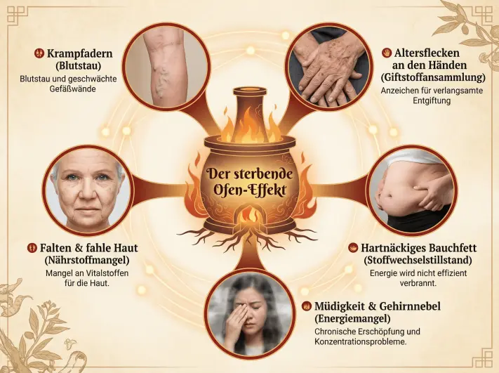 + Ich dachte, das wäre für die Darmgesundheit. Wie hilft es meinen Venen/Haut/Energie?In der chinesischen Medizin ist der Darm der "Ofen", der alles antreibt. Die moderne Wissenschaft bestätigt dies: Darmentzündungen beeinflussen die Durchblutung (Venen), das Hautbild, den Stoffwechsel (Bauchfett) und die Gehirnfunktion (Energie/Nebel). Reparieren Sie den Darm, und der ganze Körper profitiert.